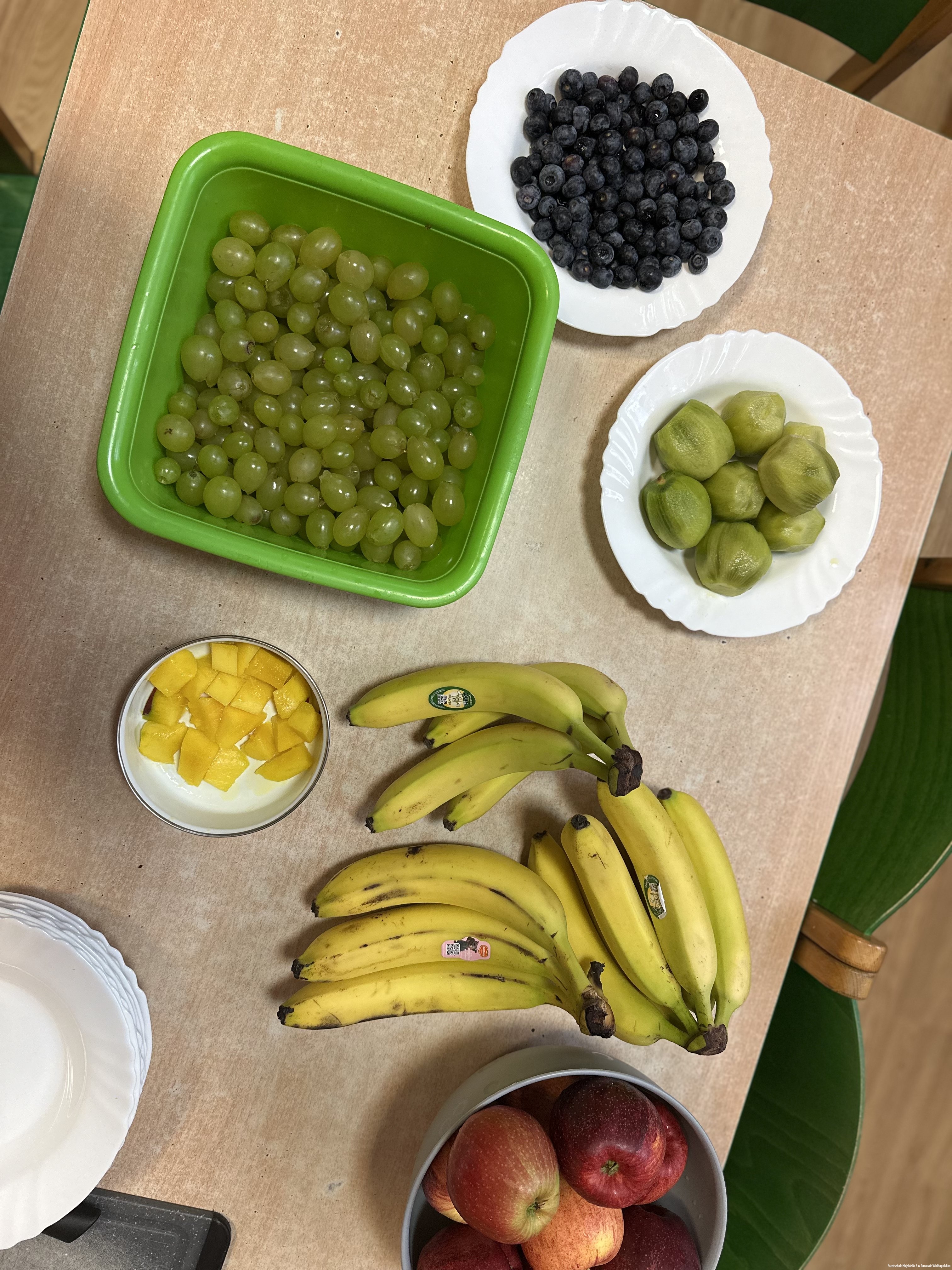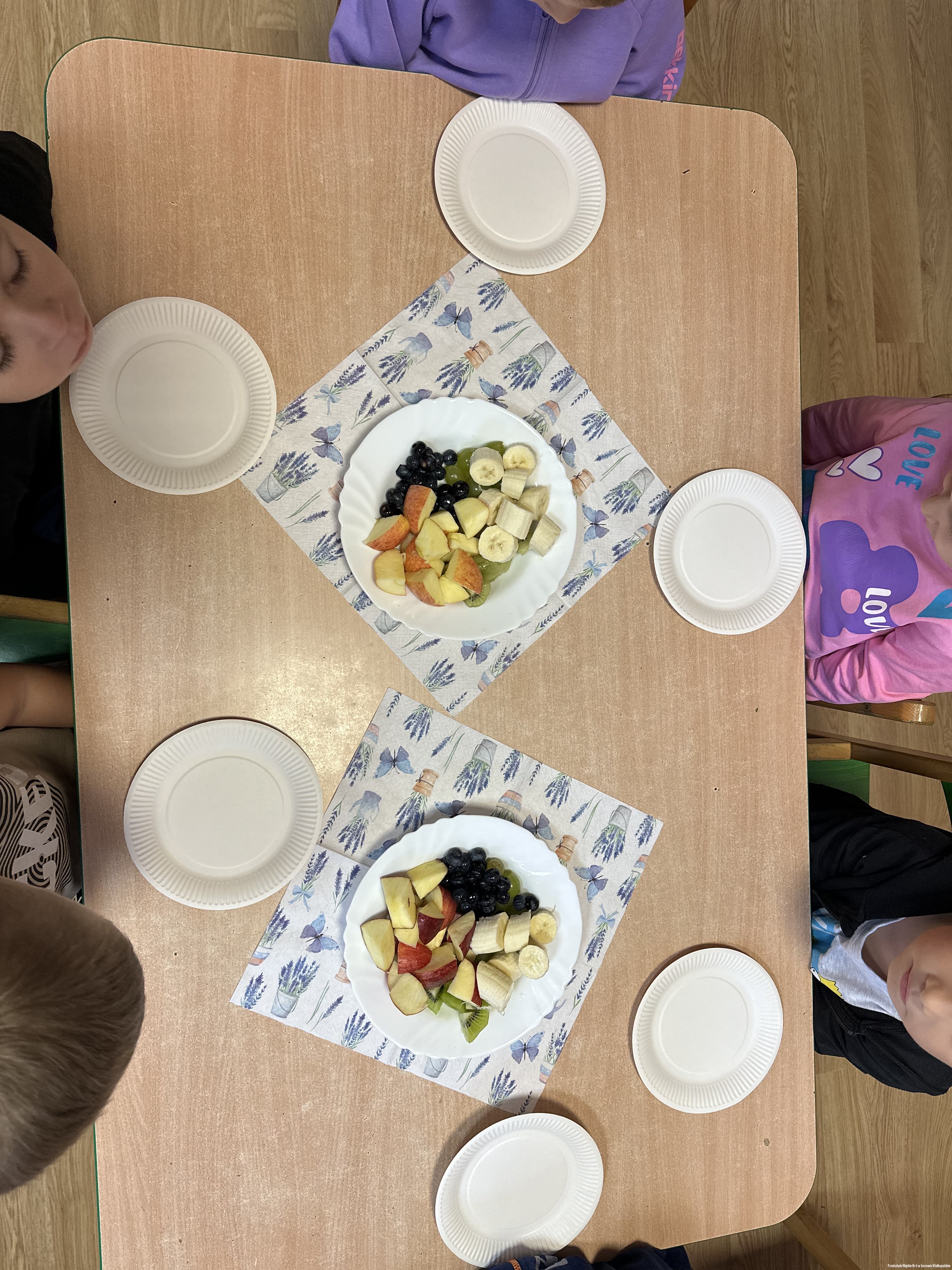 Podczas zajęć dzieci rozpoznają owoce i warzywa po kształcie, kolorze i zapachu. Wspólnie robimy pyszne sałatki, soki i szaszłyki owocowe. Każdy może przynieść swój ulubiony owoc lub warzywo i opowiedzieć o nim kolegom.
